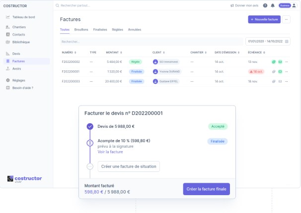 Avec Costructor, découvrez le premier logiciel de gestion dédié au BTP, intelligent et intuitif, conçu pour simplifier votre quotidien et optimiser la performance de votre entreprise.